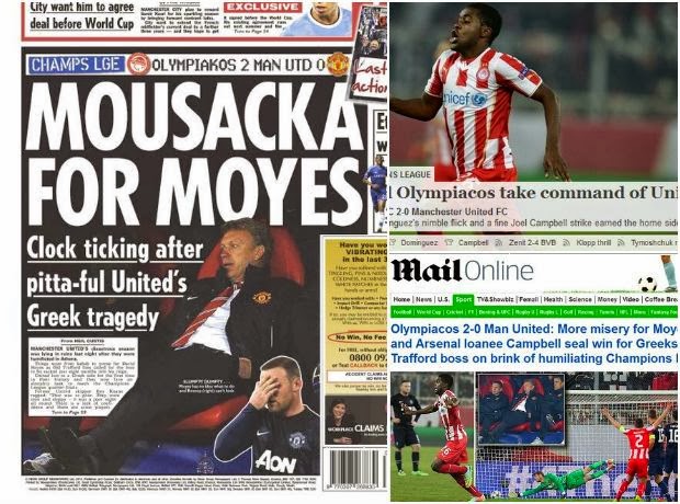 Goal.com: Ο Ολυμπιακός έβαλε τη Γιουνάιτεντ στα πρόθυρα. Οι Έλληνες φόρτωσαν και άλλη μιζέρια στην ομάδα του Ντέιβιντ Μόγιες με τη νίκη τους με 2-0 με τα γκολ των Ντομίνγκες και Κάμπελ.
